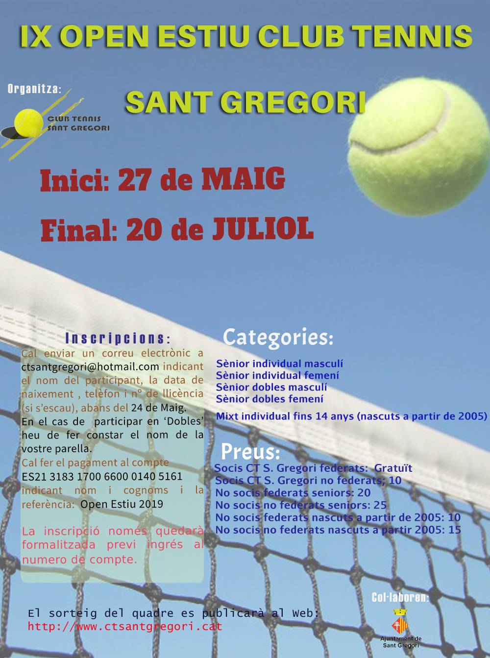 Tenim de nou l’estiu a tocar i això vol dir que tornem amb la novena edició de l’Open d’Estiu que organitza el nostre club, amb la col·laboració de l’Ajuntament de Sant Gregori.